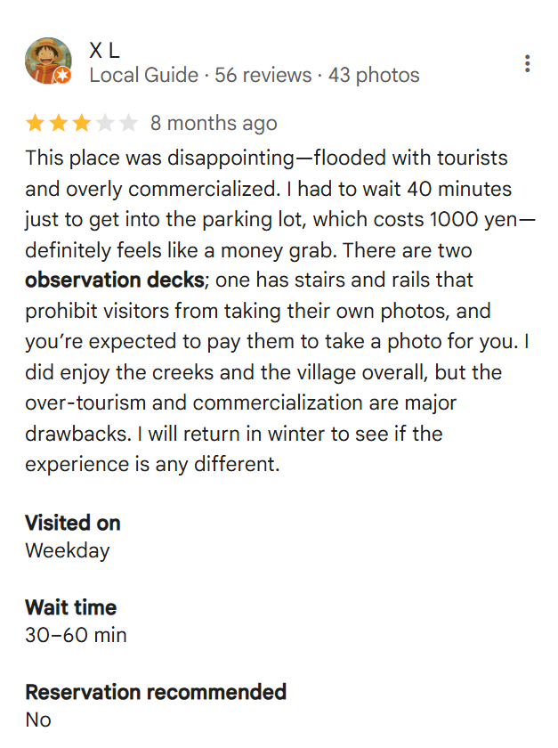 この状況は、世界遺産・白川郷のような地方観光地にも大きな示唆を与える。白川郷は雪深い山村に根ざした合掌造り集落として国内外から高い評価を受けてきた。特に冬季には幻想的な雪景色を求めて多数の観光客が訪れ、道路や駐車場、民家見学施設が過密状態となる。Googleマップのレビューからも、混雑による不満や景観体験の質の低下が繰り返し指摘されている。